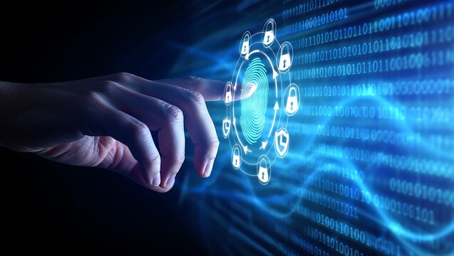 Finger touching digital security lock icon for biometric authentication and private network access control