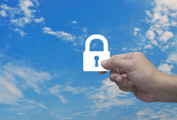 Hand holding padlock flat icon in fingers over blue sky with white clouds, Technology internet security and safety online concept