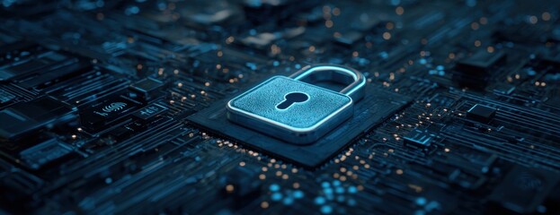 A glowing padlock icon rests on a detailed circuit board, emphasizing digital security