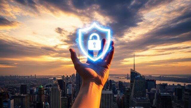 Glowing shield with padlock over cityscape implies security and protection.