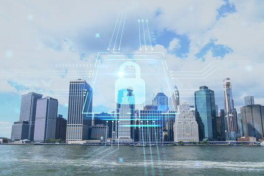 New York City skyline from New Jersey over the Hudson River towards Midtown Manhattan at day time. The concept of cyber security to protect confidential information, padlock hologram