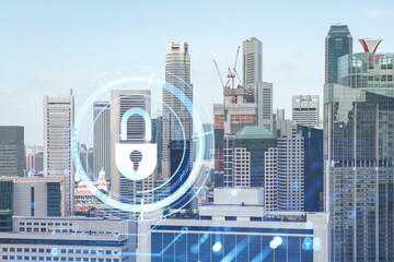 Padlock icon hologram over panorama city view of Singapore to protect business in Asia. The concept of information security shields. Double exposure.