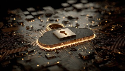 Golden padlock on a cloud symbol over a circuit board