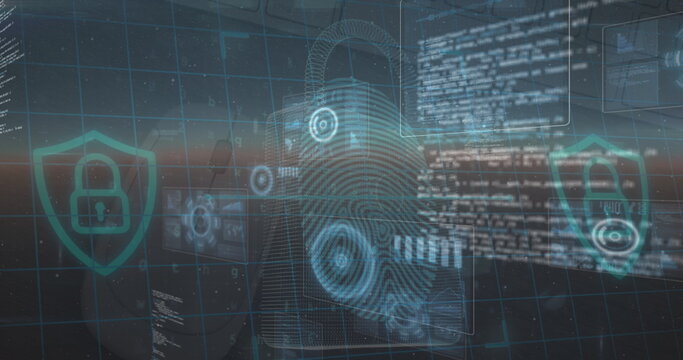 Image of shapes and padlock over server room