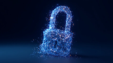 Futuristic digital security padlock made of connected dots and lines on blue background protecting data and network privacy.
