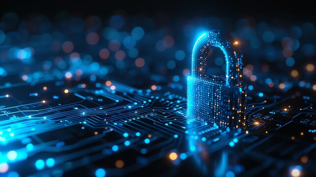 Glowing padlock and circuits symbolizing digital cybersecurity