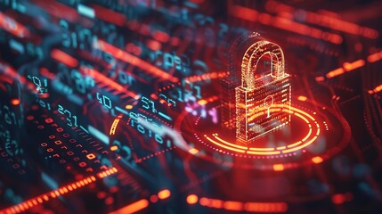 Glowing digital padlock hologram in pink and blue neon, cyber security concept, dark futuristic background with binary code
