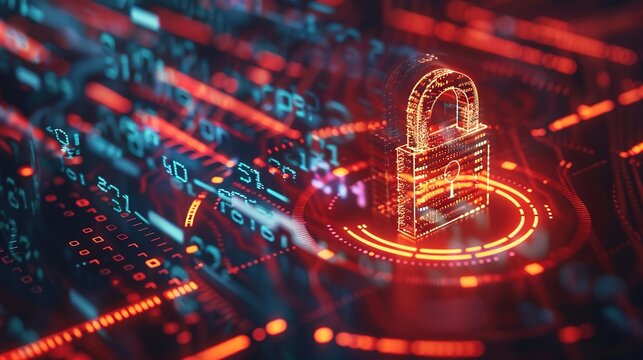 3D Padlock with connection line, with lighting shallow depth of field and glitter effect, against 0 1 binary digital number abstract background