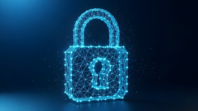 Glowing blue digital padlock constructed from a futuristic network mesh symbolizes modern data security and technology protection