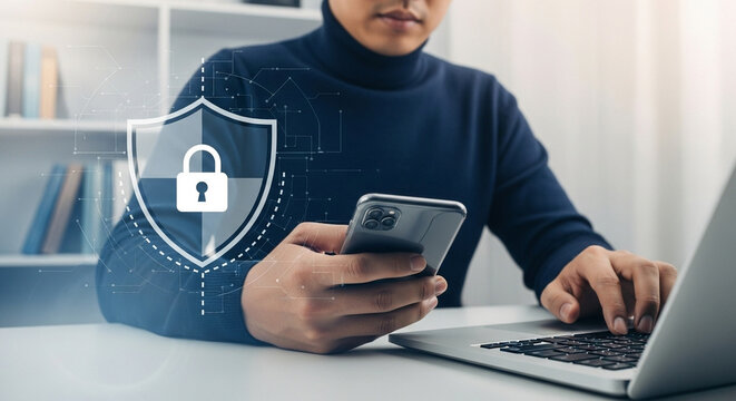 Person in turtleneck using laptop and holding phone with digital security shield overlayed on image