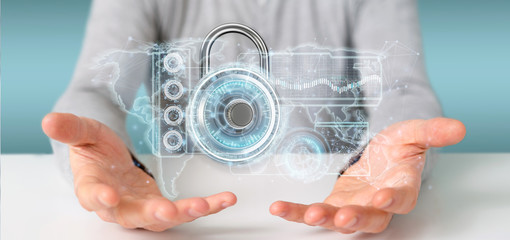 Man holding a padlock security technology interface 3d rendering