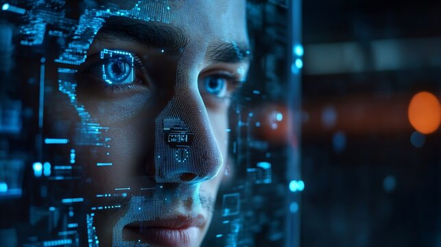 Digital human face with glowing lines and dots evokes artificial intelligence