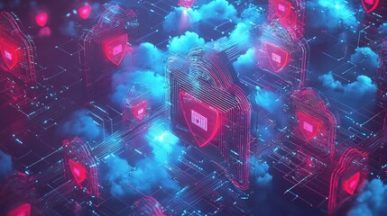 A digital representation of cloud storage with glowing data packets and lock icons indicating security and encryption.
