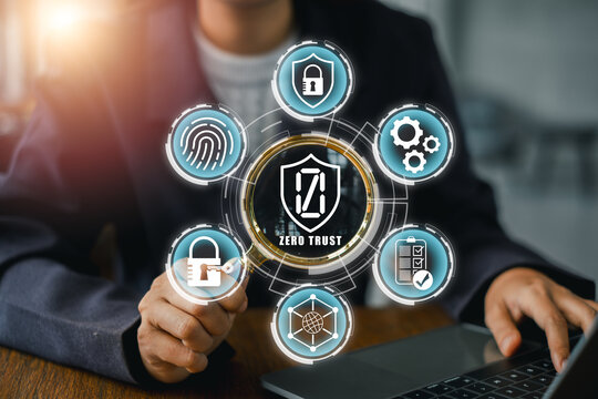 Visual representation of zero trust cybersecurity with digital icons and a business professional using a laptop.