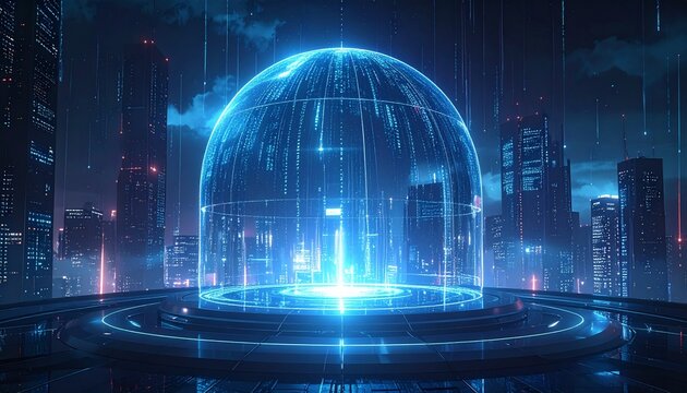 Futuristic Cityscape Encapsulated by a Data Dome, High-Tech Urban Future Protected by a Digital Shield