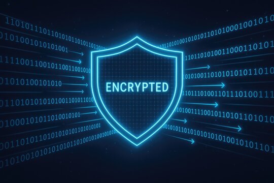 Encrypted digital shield with binary code stream data security protection encryption security.