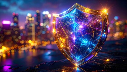 Futuristic glowing shield symbolizing digital protection and data security against a blurred vibrant city night background. Abstract technology concept.