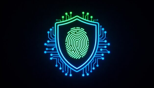 shield icon with a fingerprint in the center, biometric security system interface, glowing circuits, cyber protection, dark theme, privacy technology