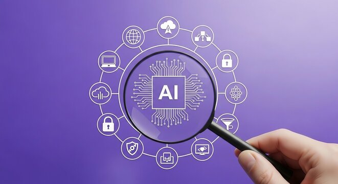 Magnifying glass examining artificial intelligence chip and network of digital icons on purple background
