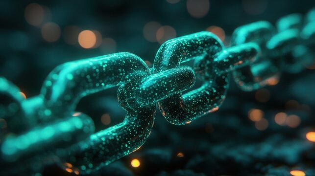Abstract close-up of a glowing teal chain,  the links interlocked and sparkling.  A digital representation of connection and security.