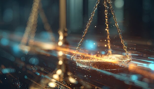 A digital representation of scales of justice with glowing particles and data streams