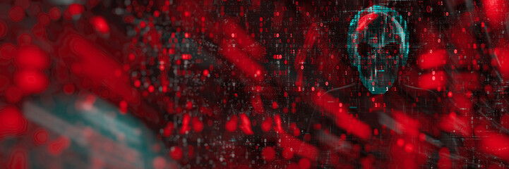 Digital hacker in a skull mask in red matrix of binary code, symbolizing cyber attack, data theft and digital security breach. Concept of cybersecurity, hacking, malware and artificial intelligence.
