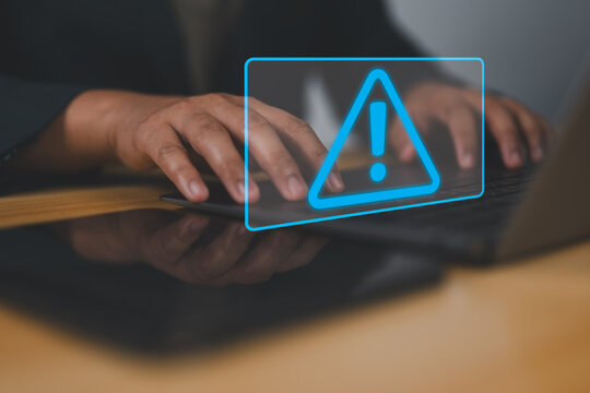 Cyber security concept. data breach man using computer with system hacked alert due to cyberattack on computer network. Triangle caution warning sign alarm for error and maintenance notification.