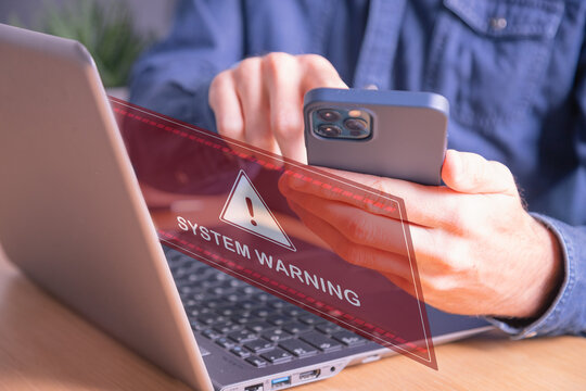 Cyber security concept. Man using computer with system hacked alert due to cyber attack on computer network. Data Protection. Internet virus cyber security and cybercrime