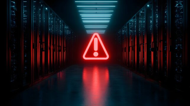 Glowing red warning sign illuminates dark digital data center corridor with server racks
