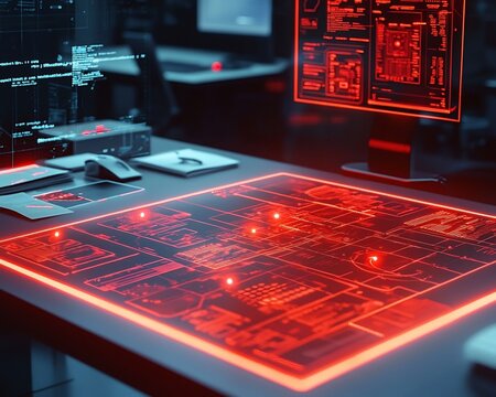 Futuristic Office Desk with Real Time Fraud Detection Markers on Financial Documents