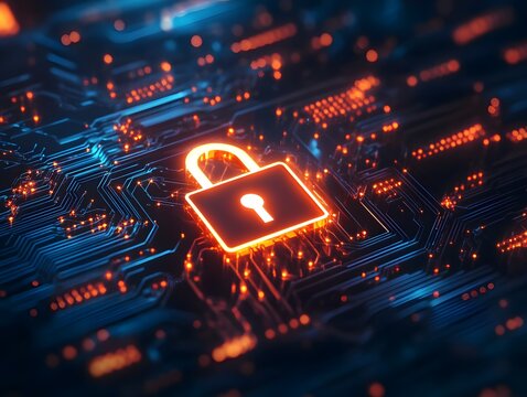 White padlock icon with circuit board overlay illustrates cybersecurity concept
