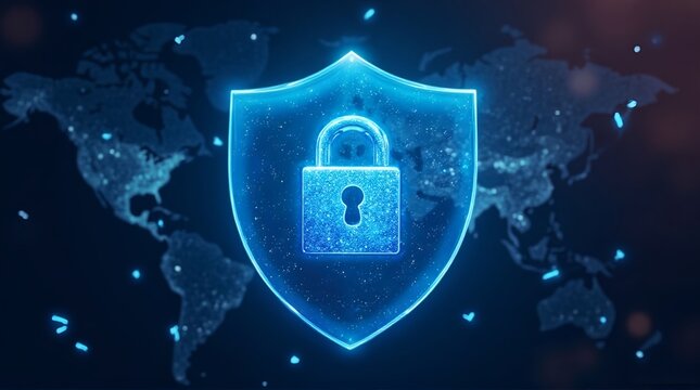 A blue glowing shield with a padlock in the center over a dark world map background illustration