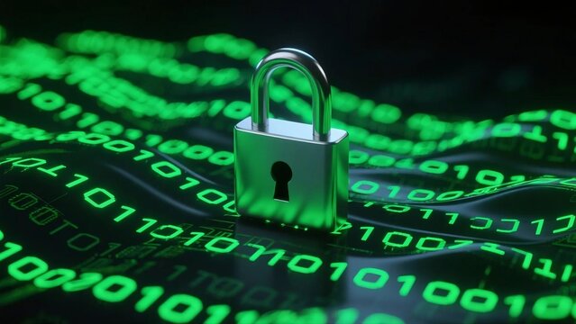 Digital padlock symbol in the center of flowing binary code, green neon light effects, cybersecurity concept, dark and dramatic visual, high-detail 3D render.
