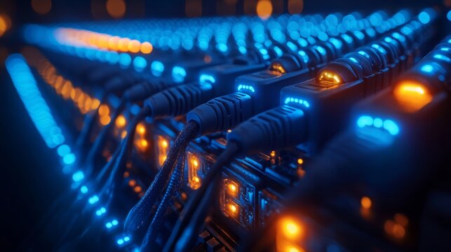 server units in cloud service data center showing flickering light indicators for massive data connection bandwidth, close up shot.