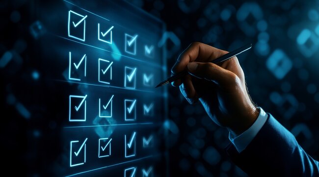 Policy approval process demonstrated by a hand pressing a check mark on a digital interface in a corporate setting during the day