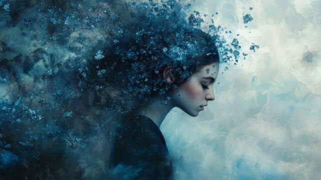 Abstract digital art of a woman with blue, broken shards surrounding her head, depicting mental illness and the need for mental health awareness