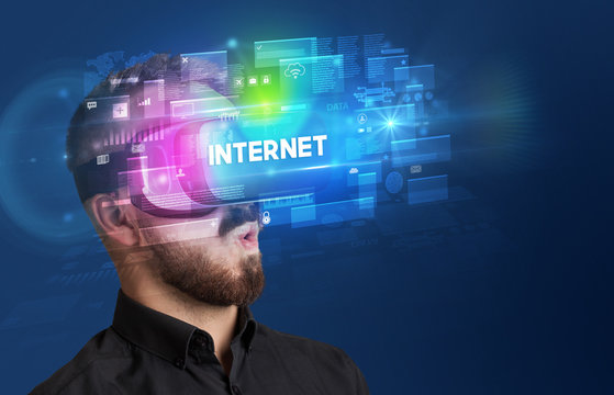 Businessman looking through Virtual Reality glasses with INTERNET inscription, innovative security concept