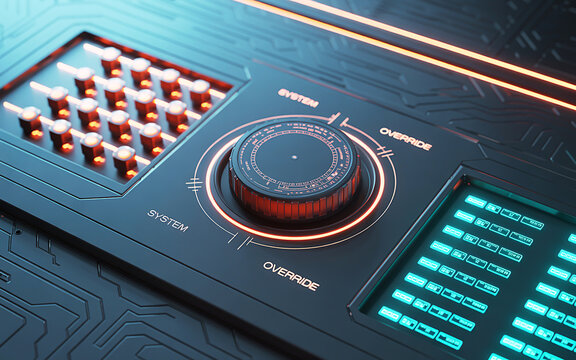 Close-up of a futuristic control panel featuring a glowing override dial, illuminated buttons, and digital screens, symbolizing advanced technology