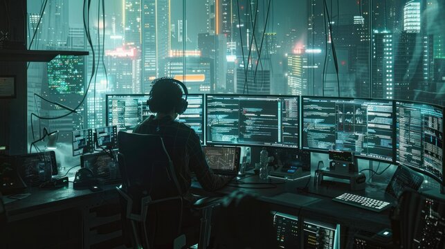 The Enigmatic Hacker: A mysterious figure cloaked in shadows, hunched over a glowing computer screen, and the digital realm with intense concentration, ready to protect the digital realm.