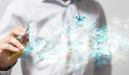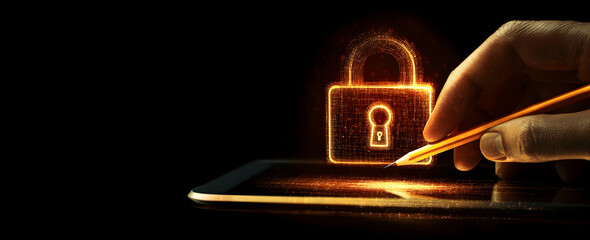 Cybersecurity design with digital lock, hand and pencil hovering over tablet, depicting data protection, privacy, encryption, and system safety