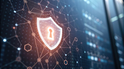 Futuristic glowing shield protecting data on a dark blue background, symbolizing cybersecurity and data protection in the digital age with abstract network connections