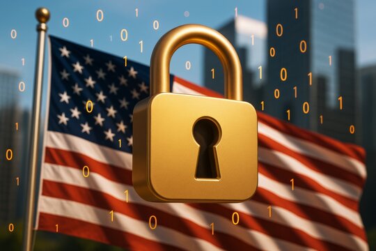 Golden padlock symbolizing cybersecurity in front of waving American flag with binary code and blurred cityscape background in bright light.