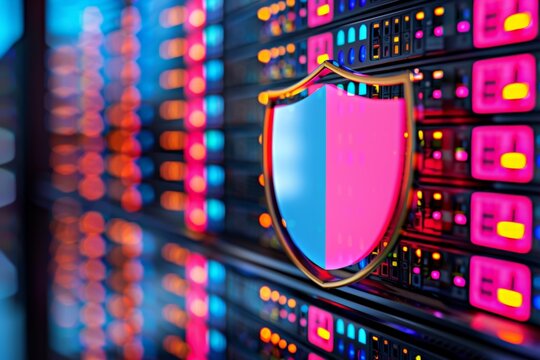Cybersecurity shield protecting data servers, symbolizing digital security