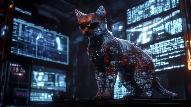 A futuristic digital cat composed of glowing particles and data streams in a high-tech environment with vivid screens displaying complex information