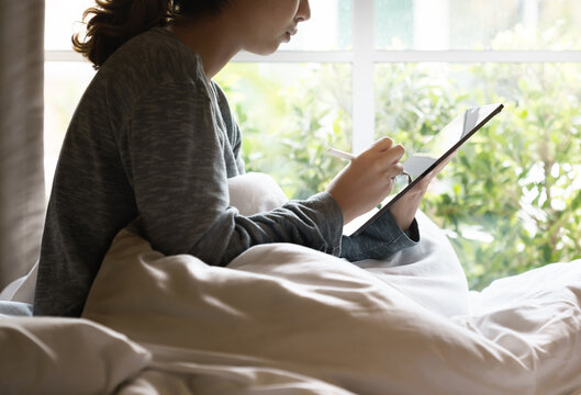 Working at morning, Worker women using stylus pen on digital tab