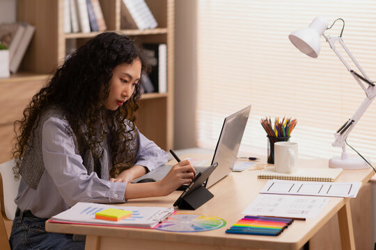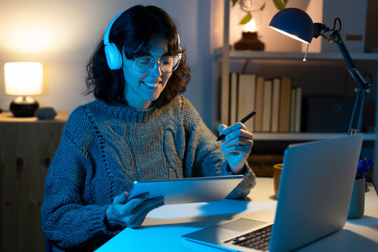 Young woman using digital tablet to draw and design late at night at home office. Technology concept.