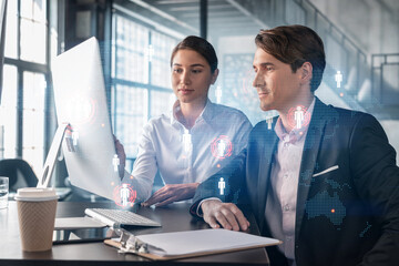 Businessman and businesswoman in formal wear working together looking for new employees to hire for international business consulting. HR, social media icons over modern panoramic office background