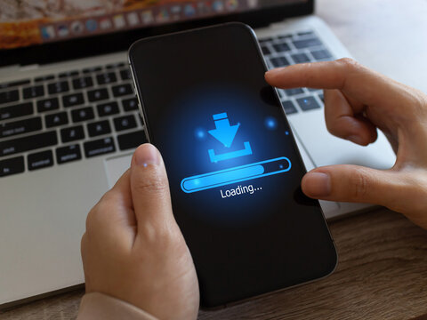 Business women using mobile and waiting to loading digital business data, download and upload, upgrade software from system.