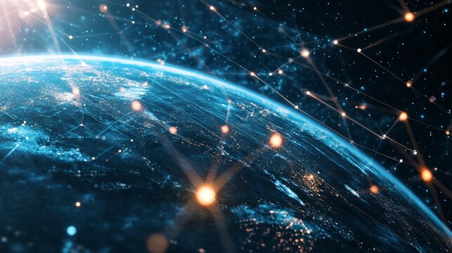 Earth from space, showing North and Central America, surrounded by nebulae.