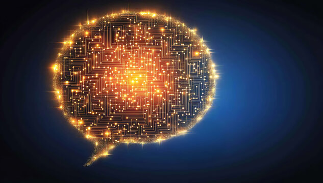 Stunning abstract image of a glowing speech bubble formed from intricate circuitry. Perfect for illustrating digital communication, AI, technology, and innovation concepts.